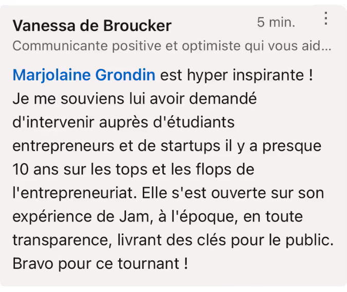 Je recommande vivement 'Le Bootcamp IA' de Marjolaine à toute personne souhaitant se lancer ou se perfectionner dans le domaine de l’IA ! Que vous soyez un novice complet ou que vous ayez déjà une certaine expérience, ce bootcamp va vous enrichir déjà personnellement, mais aussi au niveau de l’acquisition de compétences des outils IA disponibles actuellement. Merci Marjolaine.