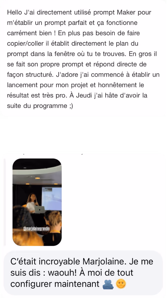 Un immense merci pour ce bootcamp sur l'IA. Grâce à tes conseils et tes outils, j'ai littéralement l'impression d'avoir pris l'autoroute des possibles dans mon secteur d'activité. Ce bootcamp va me permettre d'avancer trois fois plus vite et de gérer plusieurs projets à la fois, tout en les maîtrisant.
